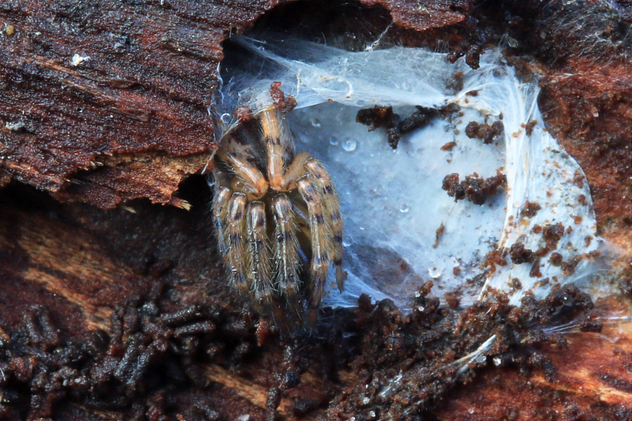 Этот паучок занимается охотой, как правило, по ночам, а днём