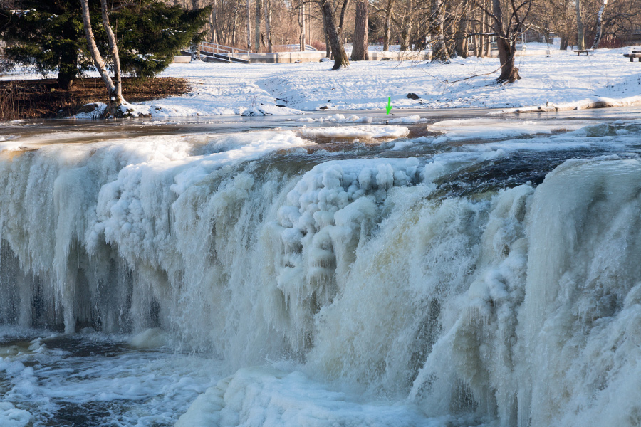 даже сквозь шум от потоков водопада можно услышать необычное для зимы птичье