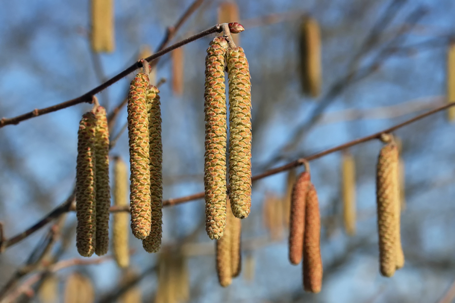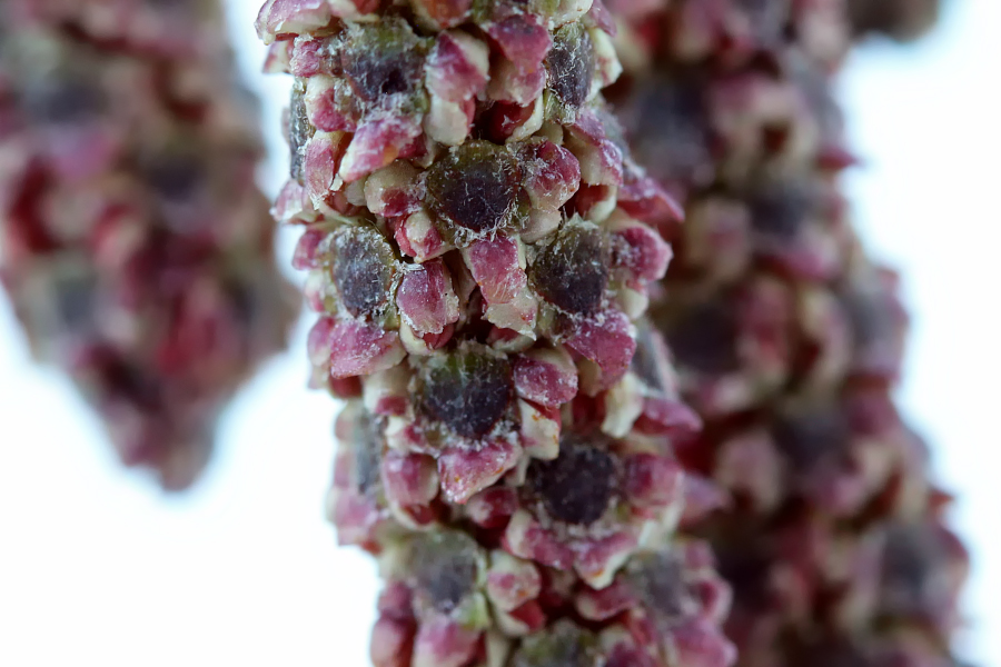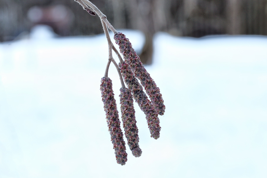 И хотя начало марта мало отличалось от конца февраля, теперь, к середине месяца, всё больше признаков говорит: «Весна идёт!». Так посмотрим на них внимательнее. Вот, казалось бы, обычный зимний пейзаж, но мартовское небо на нём выглядит словно выше и синее; в тенях на потемневшем снегу появилась голубизна, а ветви деревьев окрасились в красновато-сиреневые тона. ![]() Лес и пруд в Харку в начале марта Раскрашивают лес весной серёжки ольхи, всю зиму висевшие на деревьях плотно закрытыми, дожидаясь весны. Но теперь цветки в соцветиях начали потихоньку набухать, меняя свой цвет и придавая красноватые оттенки деревьям вдали. ![]() Серёжки ольхи. ![]() Увеличенный фрагмент серёжки ольхи – вот кто украшает деревья ольхи в марте! Женские