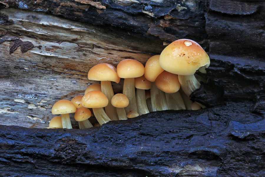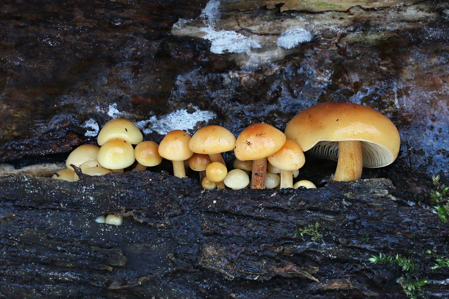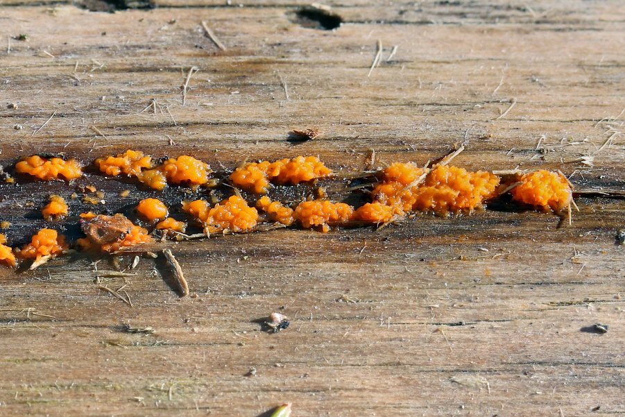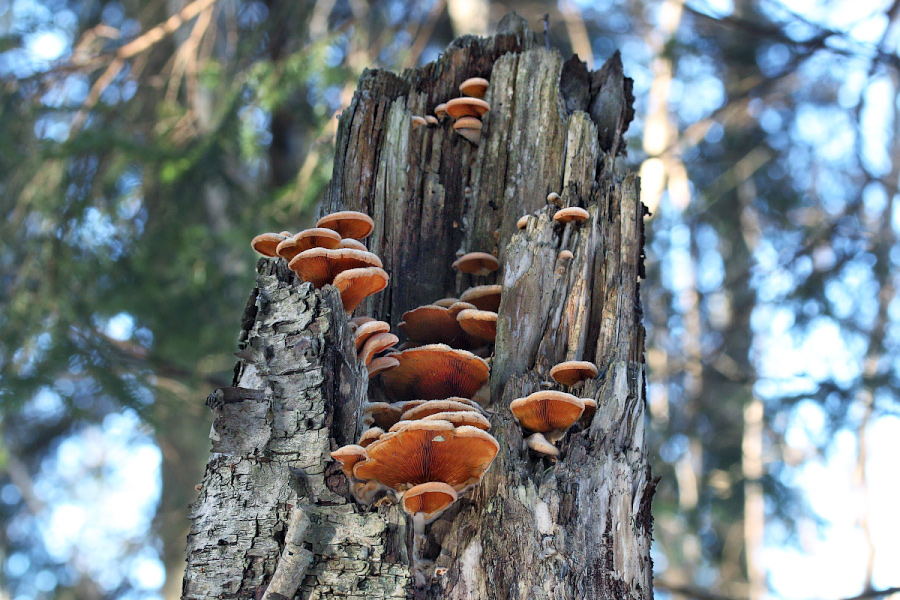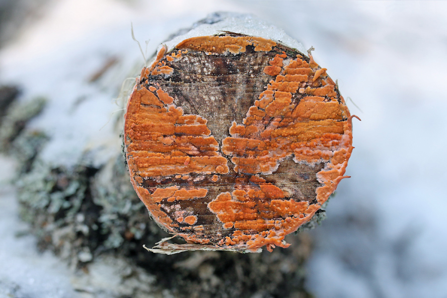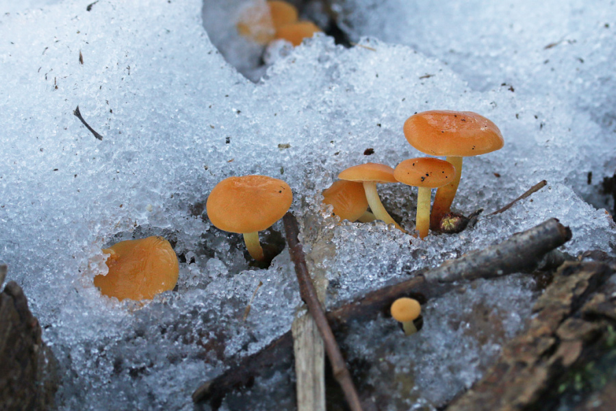 самец. ![]() Самка снегиря У любителей зимней грибной охоты настала последняя возможность полюбоваться на приметные и не боящиеся морозов грибы – зимние опята, которые тоже добавляют в мартовскую палитру свои яркие оранжевые краски. ![]() Опёнок зимний или фламмулина (лат. Flammulina velutipes), по-эстонски – puidu-sametkõrges. Зимние опята можно встретить в лесу, начиная с ноября и до самого марта. Эта весёлая компания зимних опят меня особенно порадовала тем, что не обманула ожиданий – я был уверен, что найду их в этом месте и на этом же дереве. ![]() Такой дружной и стабильной грибной семейке можно только позавидовать Зимние опята не любят часто менять место своего обитания. У меня есть много таких постоянных точек, к которым можно наведаться в зимний период и всегда найти там фламмулины на разных стадиях развития. Посмотрите на компанию зимних опят, сфотографированных на том же самом дереве год назад – сразу видно, что это одна и та же неразлучная семья. ![]() Семья зимних опят на стволе упавшего дерева, сфотографировнных ровно год назад Не обманывает ожидания и другой гриб – немного необычный, похожий на какую-то яркую плесень. В конце зимы-начале весны пениофора лососёвая радует глаз своими яркими пятнами, часто появляющимися на срезе упавших берёз, а цвет и форма бугорков тела гриба действительно напоминает лососёвую икру. ![]() Пениофора мясо-красная или лососёвая (лат. Peniophora incarnata), по-эстонски – roosa kirmik Ещё один оранжевый гриб заканчивающегося зимнего сезона – филлотопсис или вёшенка оранжевая. Филлотопсис хотя и имеет второе название, но с настоящими вёшенками родства не имеет. Встретить этот гриб на пеньках или старых деревьях можно с осени и до весны. В качестве закуски или угощения гриб не очень подходит, и хотя он не ядовит, но жестковат и невкусен, зато такая встреча может порадовать глаз. ![]() Филлотопсис гнездовидный или вёшенка оранжевая (лат. Phyllotopsis nidulans), по-эстонски – kuldkülik Почти везде под ольхой, ивой, лещиной, где земля уже очистилась от снега, повылезали миниатюрные грибки цибории, растущие на прошлогодних серёжках этих деревьев. Эти "бокальчики" росли на ивовых серёжках, значит, это цибория бокальчатая. ![]() Цибория бокальчатая (Ciboria caucus), по-эстонски – urvaliudik Точно
