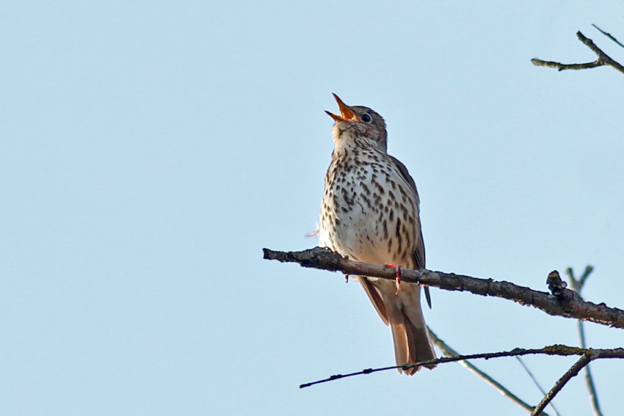 В эти дни некоторые из них тоже начинают распеваться в ближайших лесах и рощах: трудно, например, не услышать, когда в лесу, наполненном разными птичьими голосами, начинают петь певчие дрозды. Хотя у каждого из этих певцов песенки немного разные, но взрослого опытного певчего дрозда легко узнать по красоте, разнообразию и мелодичности исполнения.