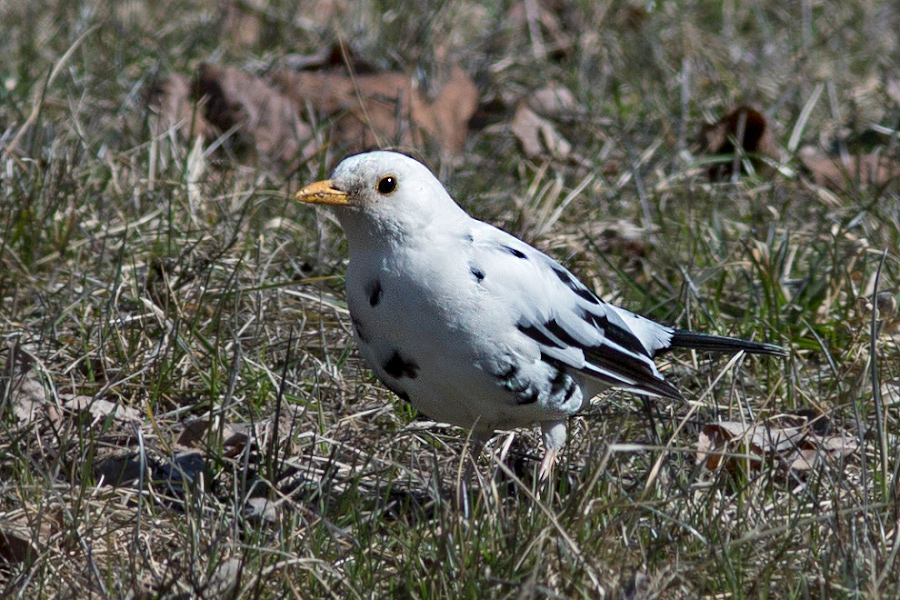 В один из этих весенних дней я отправился наблюдать за птичьей жизнью, но ещё не доехав до леса, увидел на городской лужайке необычную белую птицу с чёрными пестринами, которую издалека вначале принял за какую-то незнакомую мелкую чайку. Однако, вела себя эта незнакомка странно: по-дроздовски выискивала червей из-под прошлогодних листьев, да и осанка у неё и смешные перебежки с места на место с покачиванием хвостом тоже были похожими на дрозда. Понаблюдав ещё немного за белым незнакомцем, я понял, что это действительно был чёрный дрозд, хотя с виду и выглядел белым, потому что оказался не совсем простым, а дроздом-лейкистом.